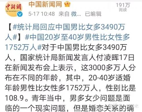 根据官方数据,目前全中国,男性比女性多3490万人,其中20~40岁的适婚年龄段内,性别比是108.9,男性比女性多1752万人。